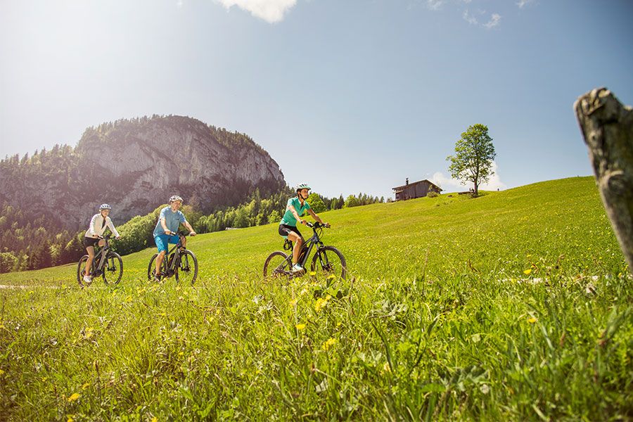 Kräftig in die Pedale treten heißt es bei allen Mountainbikern, die die Almenwelt auf zwei Rädern erkunden möchten. Eine sehr beliebte MTB-Tour führt über die Waidringer Steinplatte und die Winklmoosalm auf bayrischer Seite bis ins Unkener Heutal.